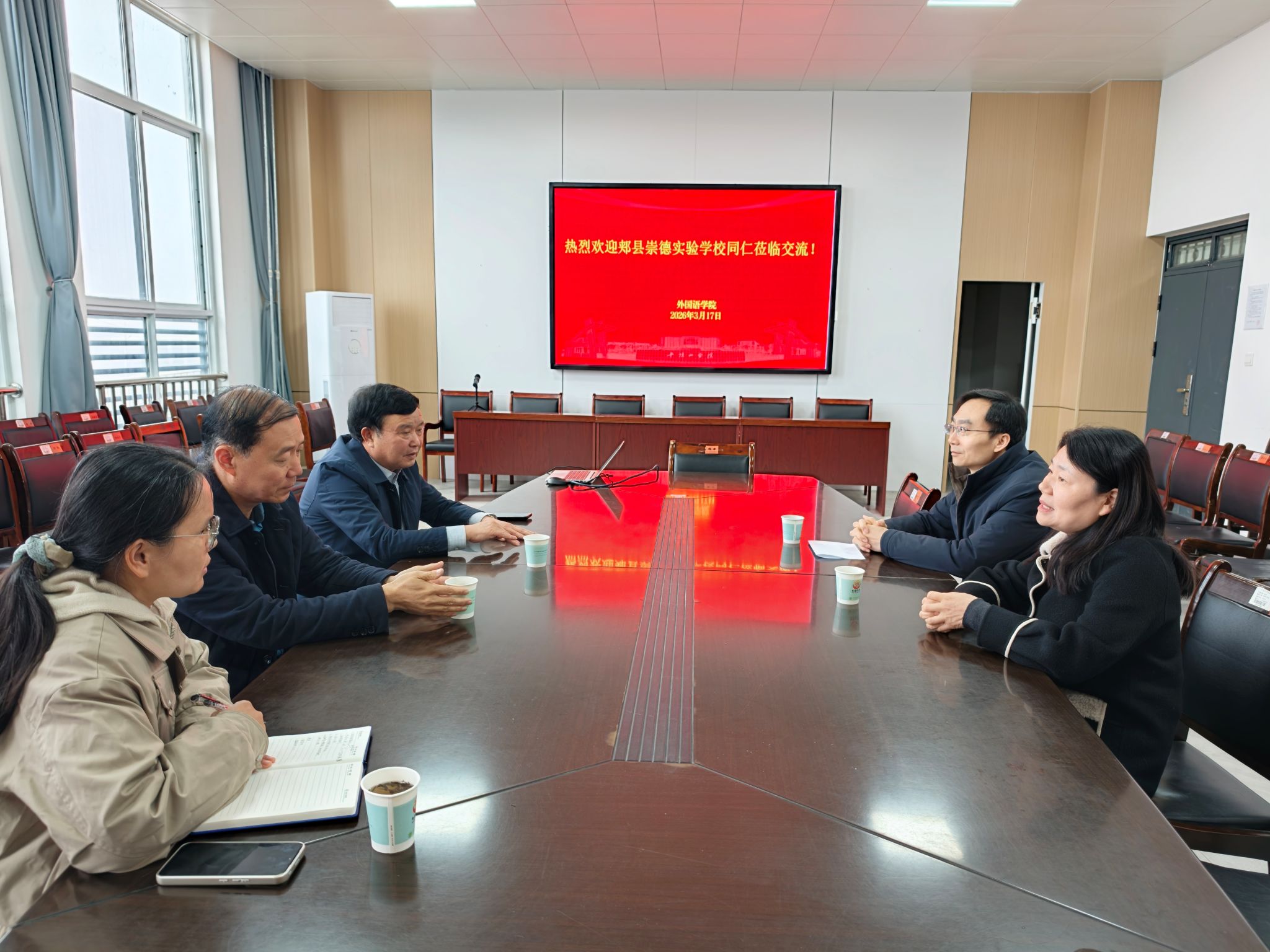 为深化校际合作、拓宽人才培养路径、促进教育资源共享,3 月 17 日下午,郏县崇德实验学校校长刘学增率及相关部门负责人一行,莅临我院考察交流。外国语学院党委书记甘泉、院长蒋领敏、毕业生辅导员袁立文等参加座谈。